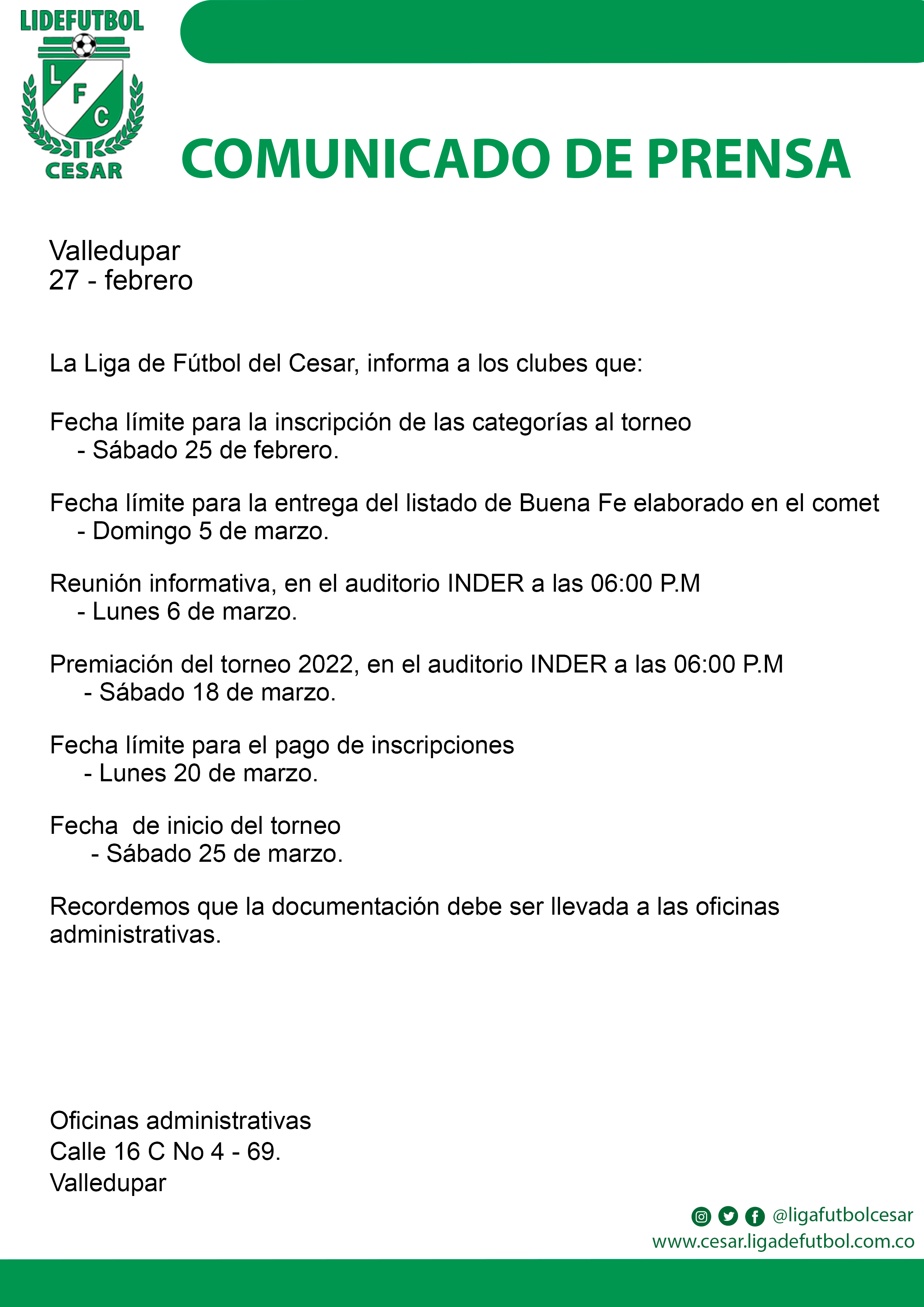 Comunicado de Prensa: Información a los clubes sobre el Torneo de la Liga.