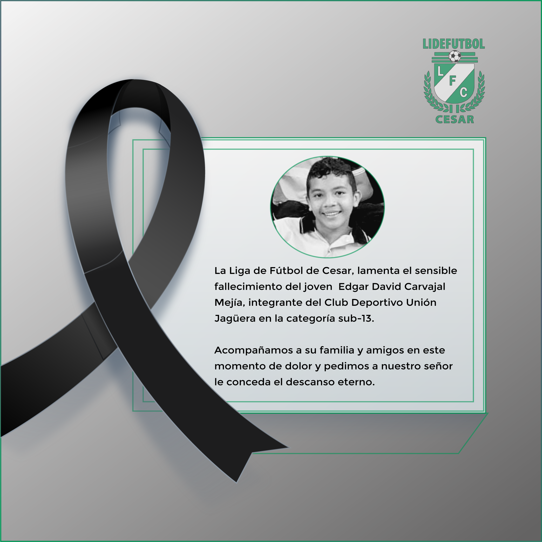 La Liga de Fútbol del Cesar, lamenta el sensible fallecimiento del joven Edgar David Carvajal Mejía, integrante del Club Deportivo Unión Jagüera en la categoría sub–13.